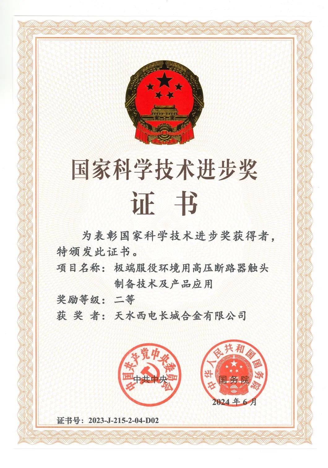 天水合金1項(xiàng)成果榮獲國家科學(xué)技術(shù)進(jìn)步獎(jiǎng)二等獎(jiǎng)近日,2023年度國家科學(xué)技術(shù)獎(jiǎng)在京揭曉,一大批貢獻(xiàn)卓越的,科學(xué)家和標(biāo)志性成果,獲得國家科技獎(jiǎng)勵(lì)。其中天水合金1項(xiàng)成果《極端服役環(huán)境用高壓斷路器觸頭制備技術(shù)及產(chǎn)品應(yīng)用》獲評(píng)國家科學(xué)技術(shù)進(jìn)步獎(jiǎng)二等獎(jiǎng)。 該項(xiàng)目由中國西電所屬天水合金、西開電氣、西開有限3家企業(yè)參與,圍繞極端服役環(huán)境用高壓斷路器觸頭制備技術(shù)及系列產(chǎn)品研制,開展了觸頭材料研發(fā)-應(yīng)用驗(yàn)證-產(chǎn)品迭代的系統(tǒng)性研究,形成了一套高電壓大容量電工觸頭材料性能檢測和失效分析研究理論,開發(fā)了超強(qiáng)耐燒、超高耐磨...