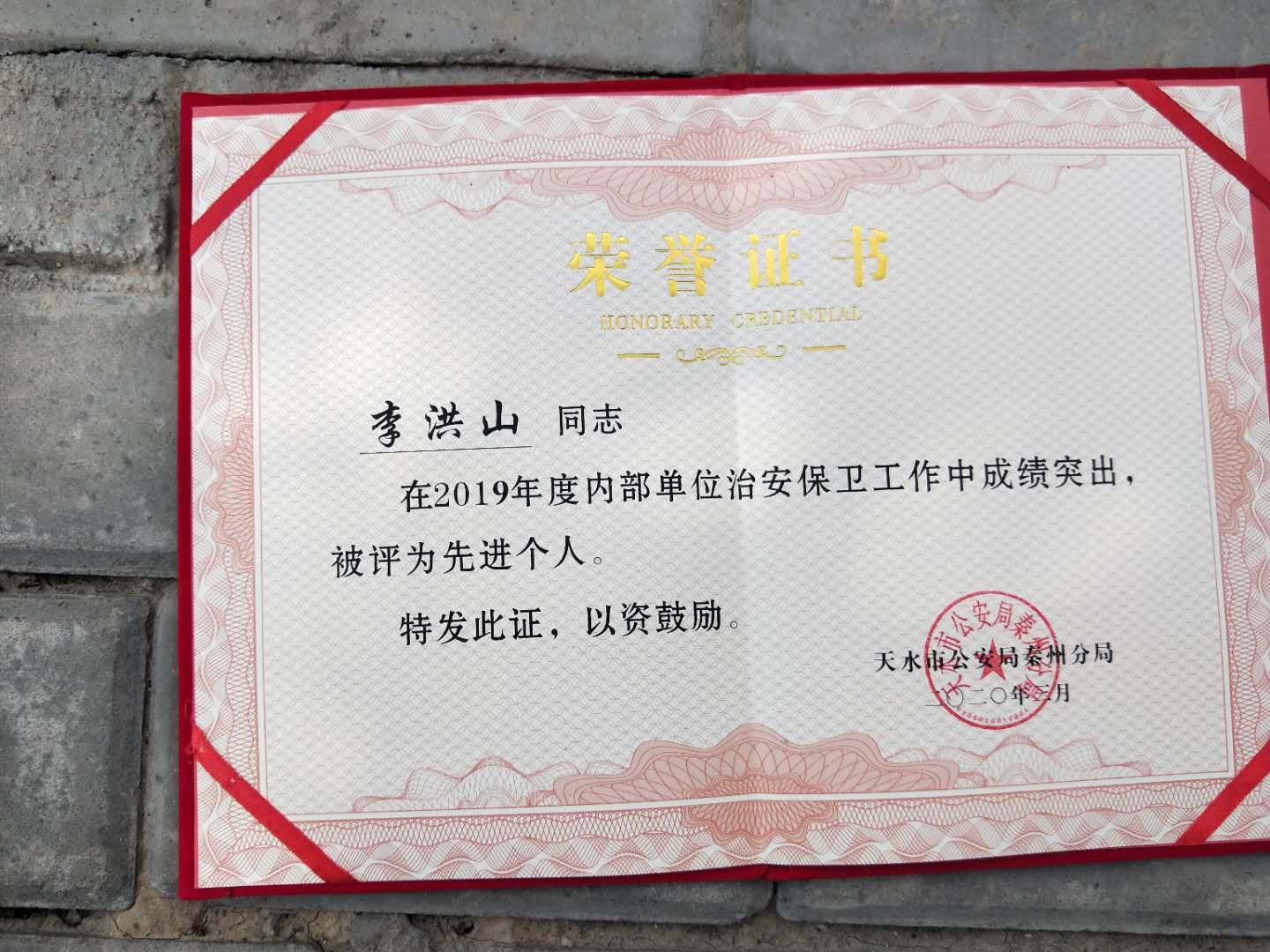 天水合金李洪山榮獲天水市公安局秦州區(qū)分局治安保衛(wèi)工作“先進(jìn)個(gè)人”榮譽(yù)稱號(hào)