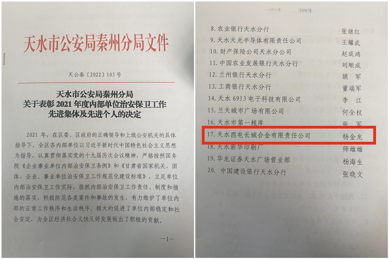 316日,天水市公安局秦州區(qū)分局發(fā)布《關(guān)于表彰2021年度內(nèi)部單位治安保衛(wèi)工作先進(jìn)集體及先進(jìn)個人的決定》,天水合金武保室楊金龍同志被評為“2021年度內(nèi)部單位治安保衛(wèi)工作先進(jìn)個人。